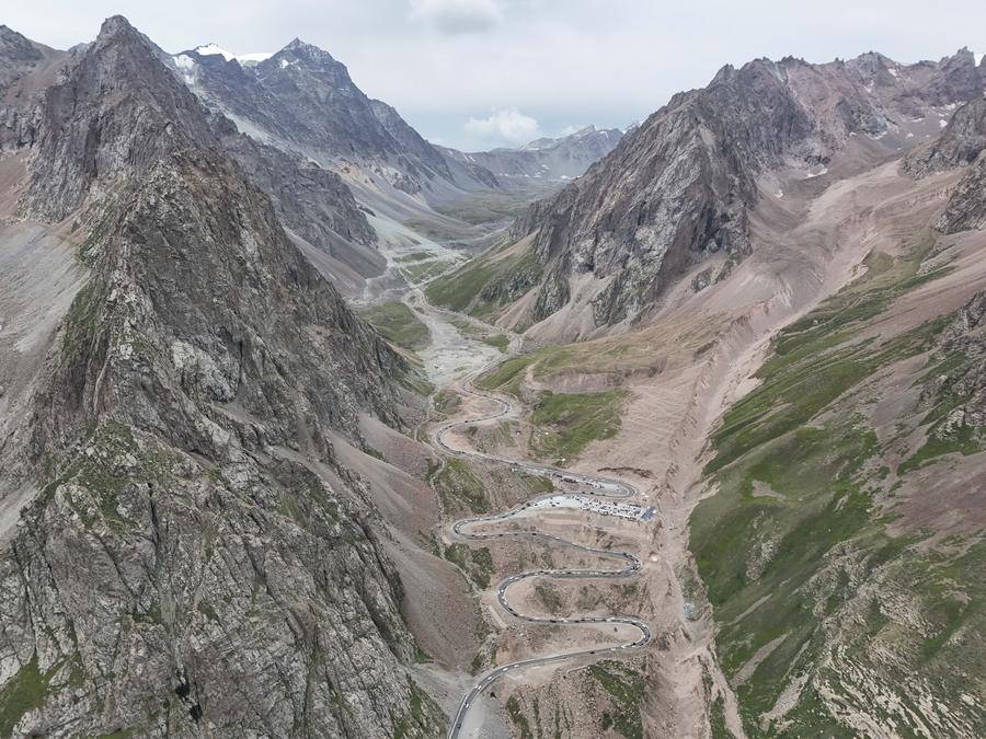 An aerial drone photo taken on July 15, 2025 shows a section of the Duku Highway in northwest China's Xinjiang Uygur Autonomous Region. (Xinhua/Hu Huhu)
