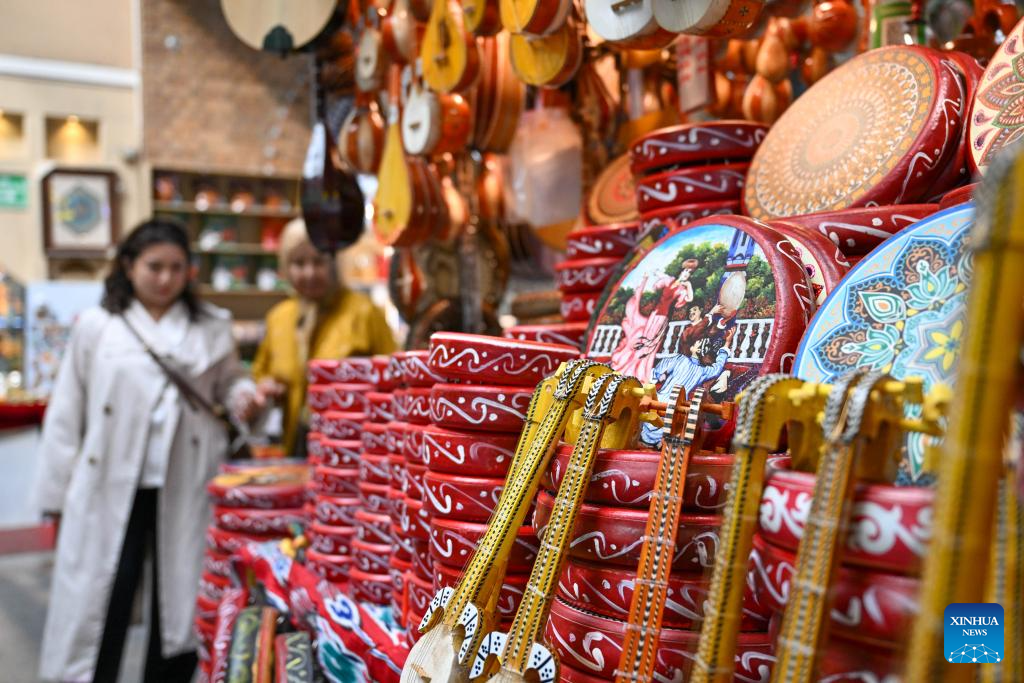 Tourists select commodities at the Xinjiang International Grand Bazaar in Urumqi, northwest China's Xinjiang Uygur Autonomous Region, Oct. 1, 2025. (Xinhua/Ding Lei)