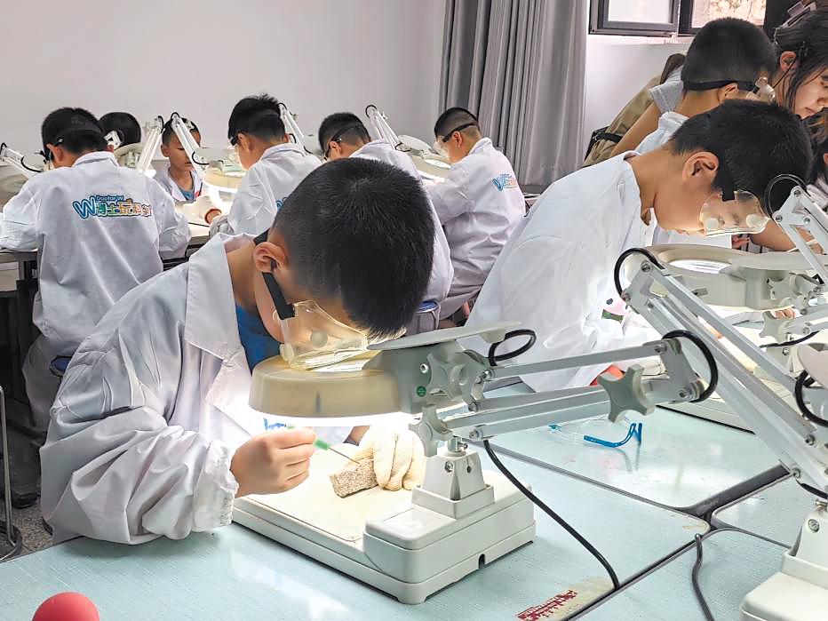 Children take part in a science education activity simulating the daily work of fossil restoration specialists at the Xinjiang Natural Museum. LIU ZIXUAN/FOR CHINA DAILY