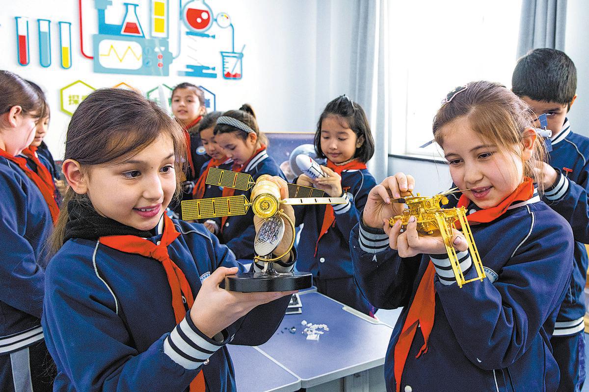 Students examine models of various spacecraft at a community center in Urumqi in December. SUN ZHENSONG/FOR CHINA DAILY