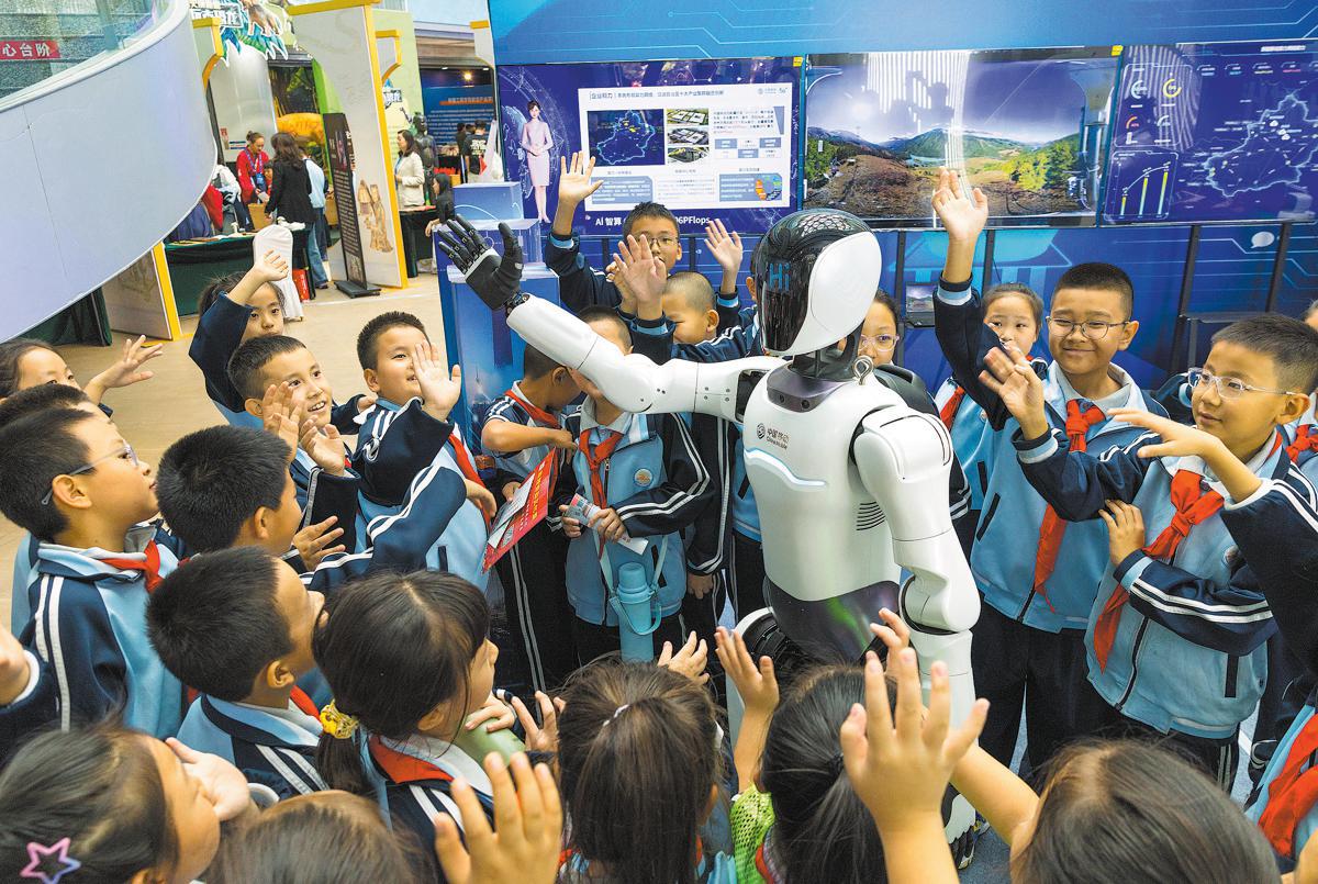 Students from the No 73 Elementary School in Urumqi greet a robot at the Xinjiang Museum of Science and Technology on Sept 5. SUN ZHENSONG/FOR CHINA DAILY
