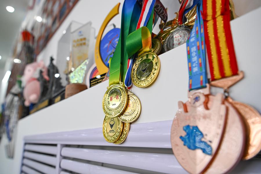 This photo taken on Oct. 25, 2025 shows medals and trophies Wu Junliang has earned in archery competitions.