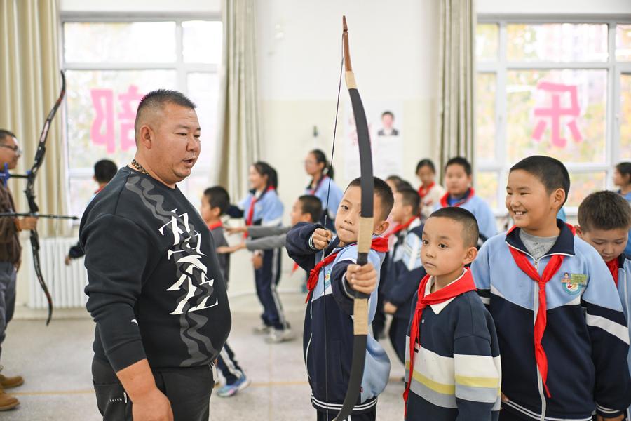 Wu Junliang (L front) teaches traditional archery at the Yining No.25 Primary School in Yining City, northwest China's Xinjiang Uygur Autonomous Region, on Oct. 23, 2025.