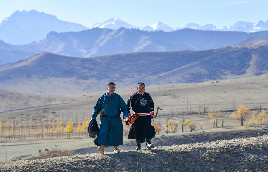 Wu Junliang (R) and his apprentice Jiang Kaiwen carrying bows, arrows and a target walk on a hill in Qapqal Xibe Autonomous County, northwest China's Xinjiang Uygur Autonomous Region, on Oct. 24, 2025.