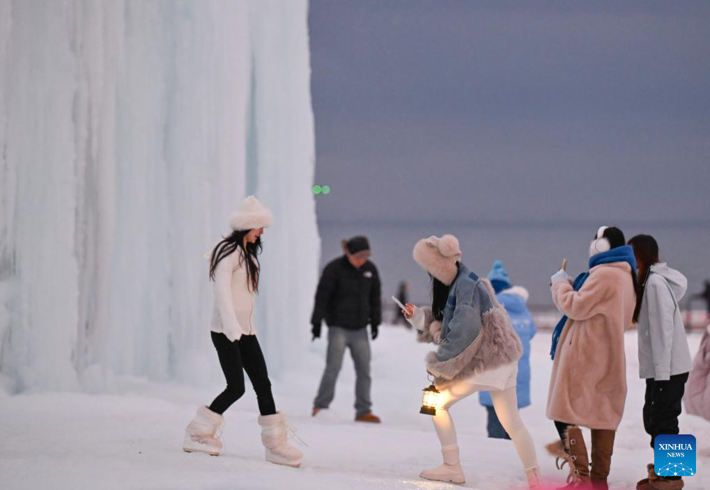Tourists have fun on the frozen surface of the Sayram Lake in Bortala Mongolian Autonomous Prefecture, northwest China's Xinjiang Uygur Autonomous Region, Dec. 16, 2025. (Photo by Xu Rui/Xinhua)
