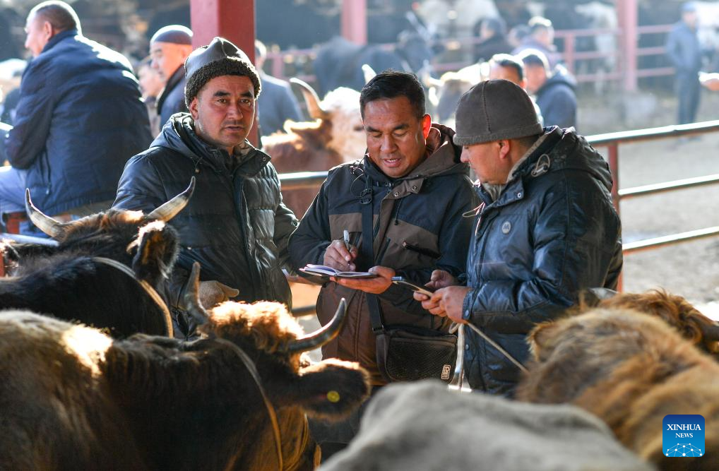 Ma Jun (C) records a seller's telephone number after purchasing his cattle at Huanggong Bazaar, Xinjiang's largest livestock market, in northwest China's Xinjiang Uygur Autonomous Region, on Dec. 3, 2025. (Xinhua/Hu Huhu)