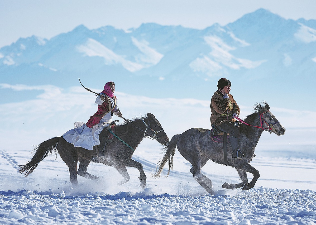 Herders perform horse riding for tourists at Zhaosu Wetland Park in Zhaosu, Xinjiang Uygur autonomous region, on Jan 3. HU HUHU/XINHUA