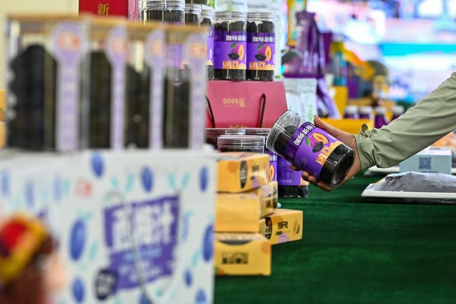 This photo taken on Sept. 2, 2023 shows plum products displayed at a plum industry park in Payzawat, northwest China's Xinjiang Uygur Autonomous Region. (Xinhua/Ding Lei)