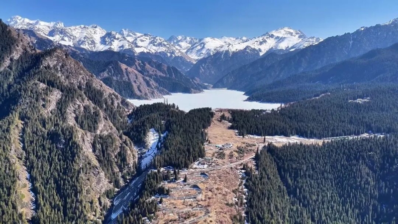 In April, the surface of Tianchi Lake is still covered with clear ice, yet its edges have quietly begun to melt. The snow-capped Bogda Peak in the distance contrasts beautifully with the lush green spruce forests nearby. This unique winter-spring scenery has become one of the most popular spots for outings.